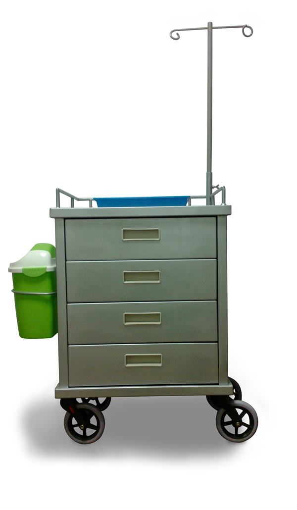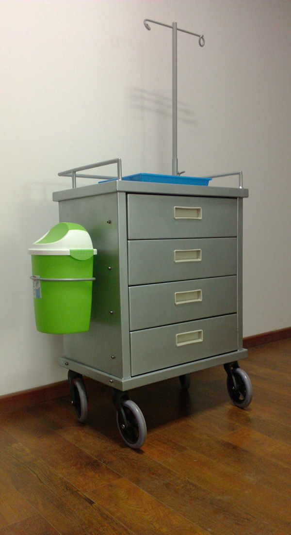 产品结构:框架、抽屉、塑料垃圾桶、6寸灰色PU发泡轮、输液支架